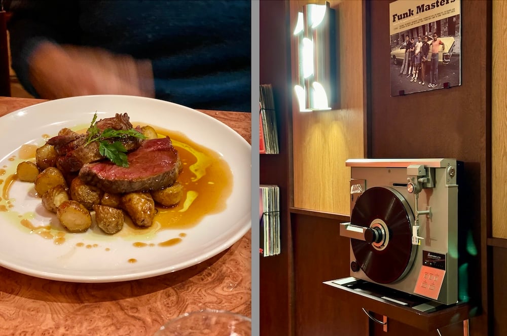 Le resto ne coche en rien les standards bruts du moment. Le béton laisse la place à l’ocre chatoyant, les chaises dépareillées aux fauteuils velours et cuir, et les tables en formica façon loupe d’orme n’ont rien à envier à celles de Véronique et Davina.