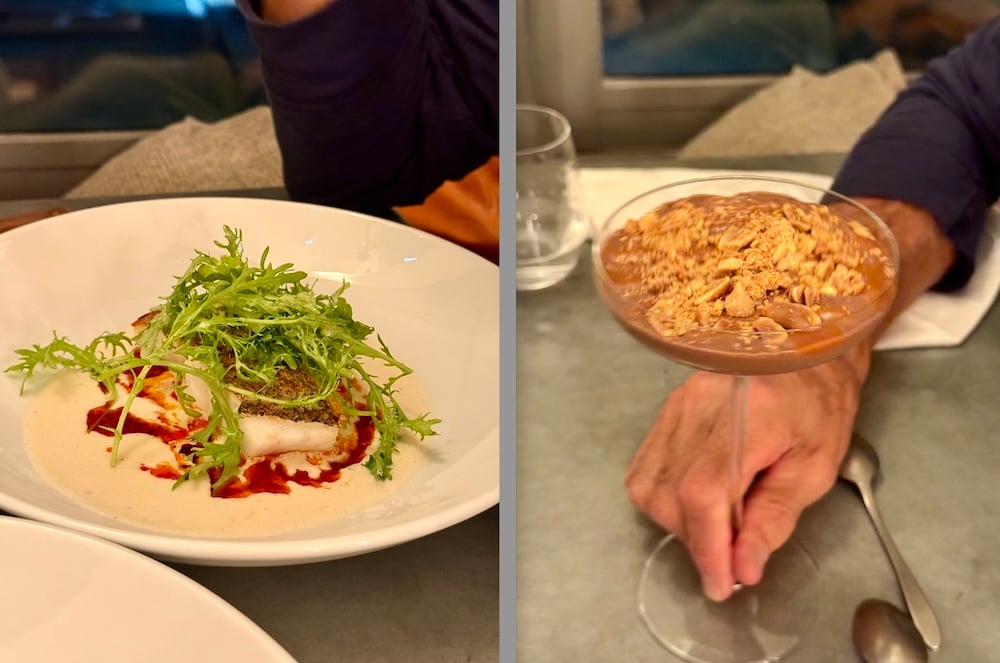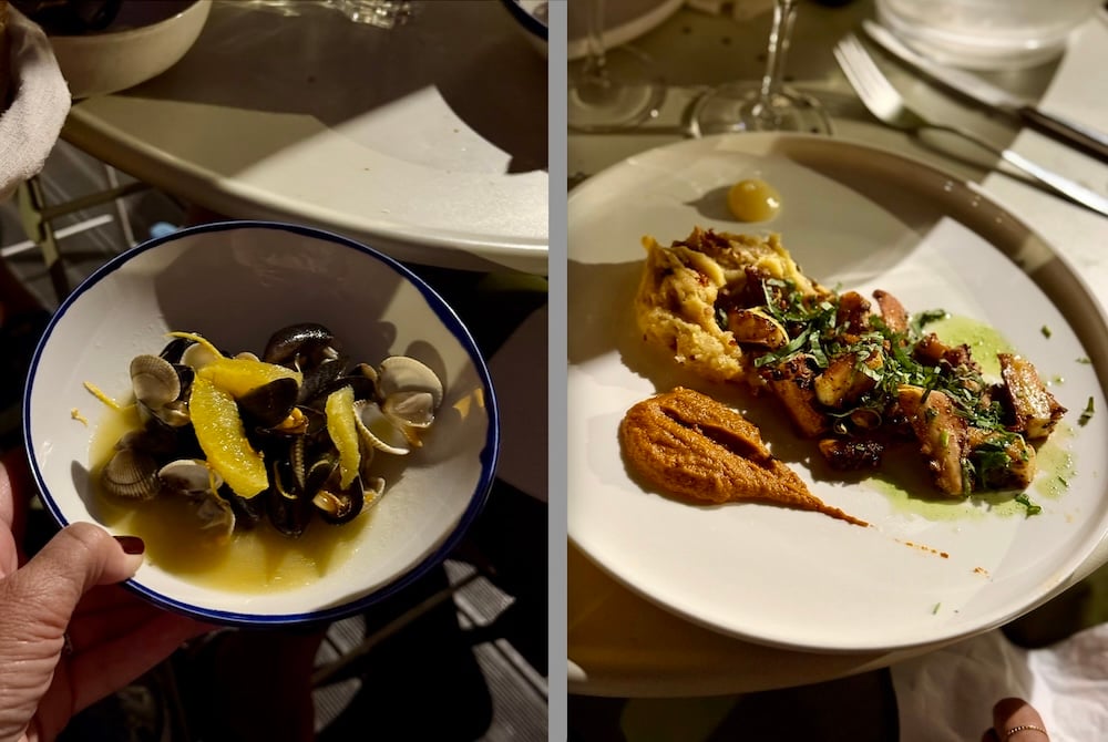 Ce soir-là, il y a du poulpe, braisé et snacké, et du maquereau grillé à la flamme. Bon point pour les produits, évidemment bien sourcés. En entrée, une petite nage de moules et coques à l’orange, qui aurait mérité d’être un poil plus généreuse.