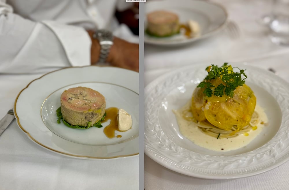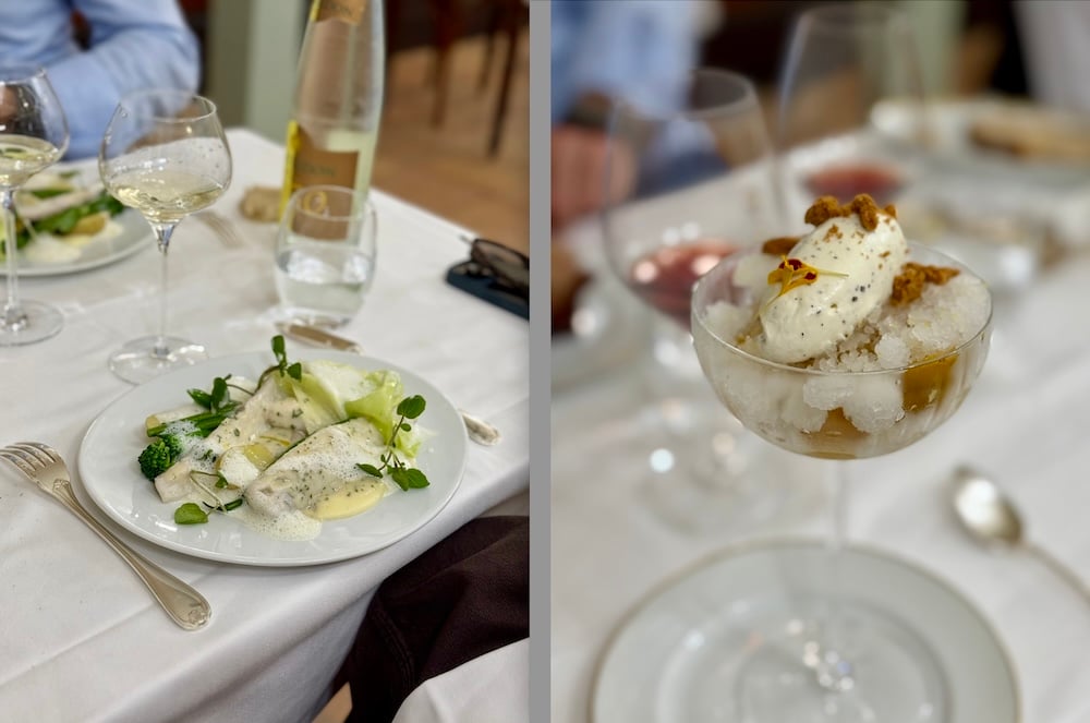 En entrée, le foie gras est dément, et les poireaux vinaigrette, tourteau-sarrasin méritent déjà l’étoile. J’ai opté pour les capellini aux pèches, crème Vichyssoise, gambas (oui, oui aux pèches), suaves.