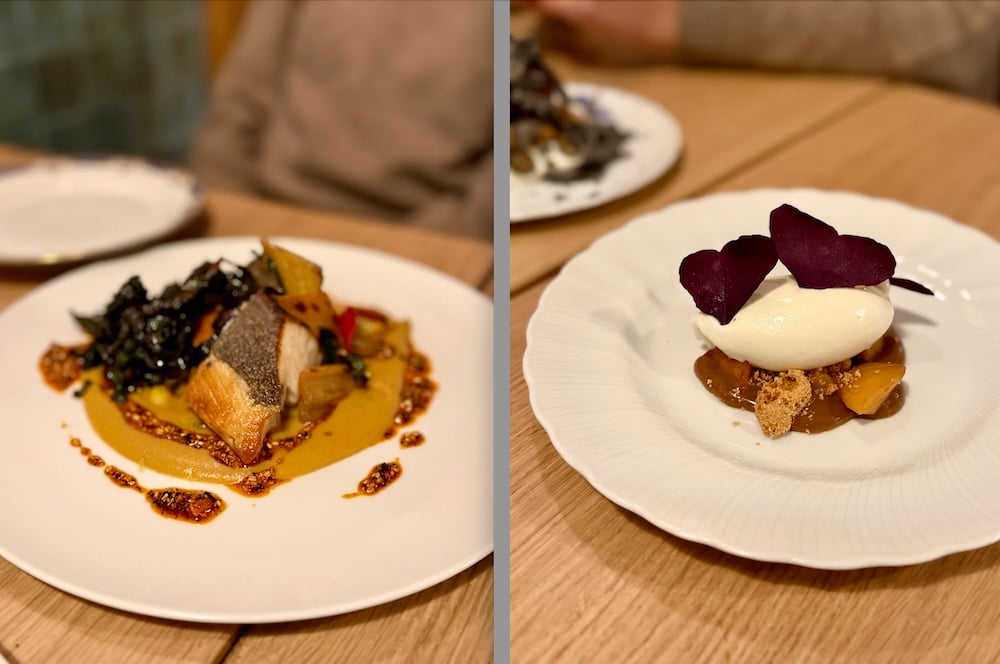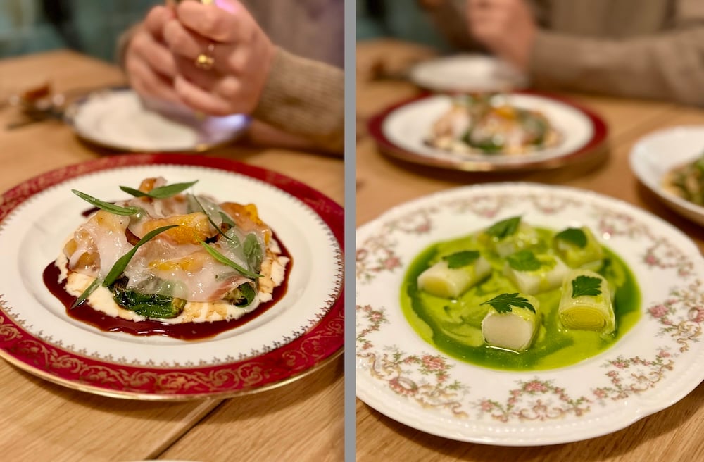 En entrée, les poireaux vapeurs, sauce persil-menthe, le potimarron sauce cacio e pepe, et les champignons, poivre vert et noisettes, naviguent entre la Botte et la Scandinavie.
