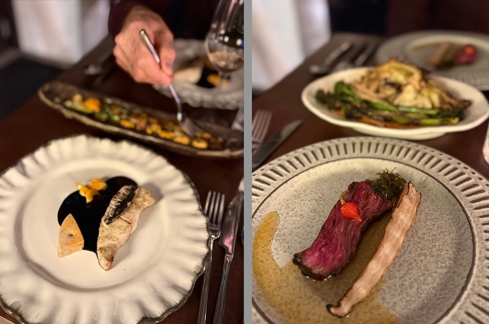 Je suis bien incapable de vous dresser la liste exhaustive de ce que nous avons dégusté : flan d’oursins, maigre sauce à l’encre, sardines, poireaux brûlés, foie de lotte, incroyable bœuf wagyu, salsifis, chou, brocolis… le tout accompagné de condiments acidulés, pimentés, corsés.