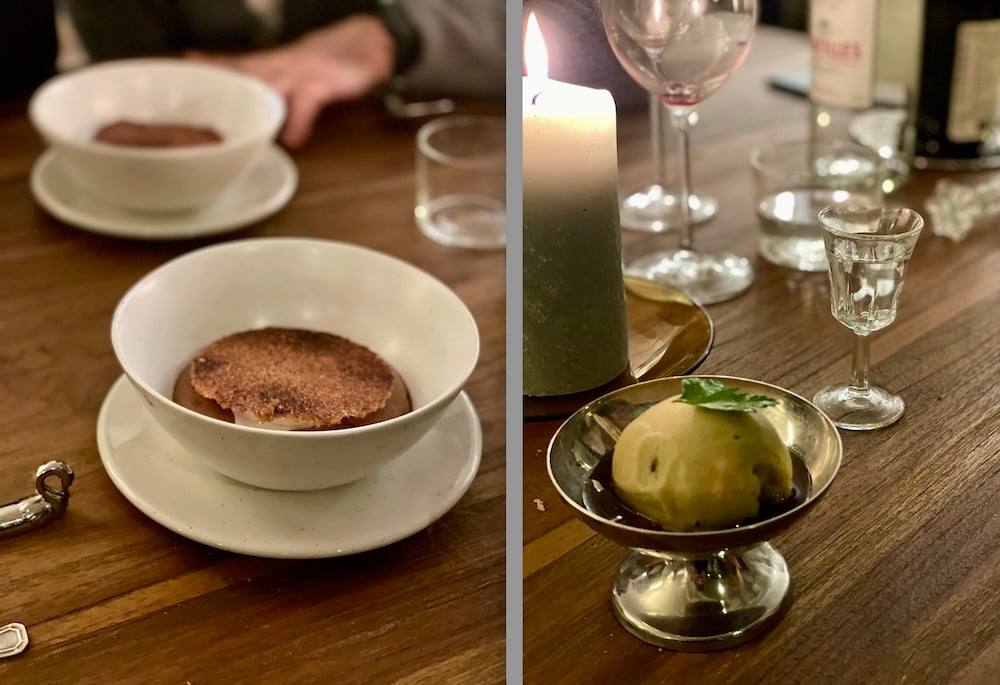 C’est que nous ne voulions pas rater les desserts… Soufflé au chocolat Plaq, praliné olive-noisette, touches de fontainebleau et tuile mélilot (une plante aux accents de vanile-tonka-foin) et le trou gascon revisité : pruneaux à l’Armagnac, sorbet pomme-persil.