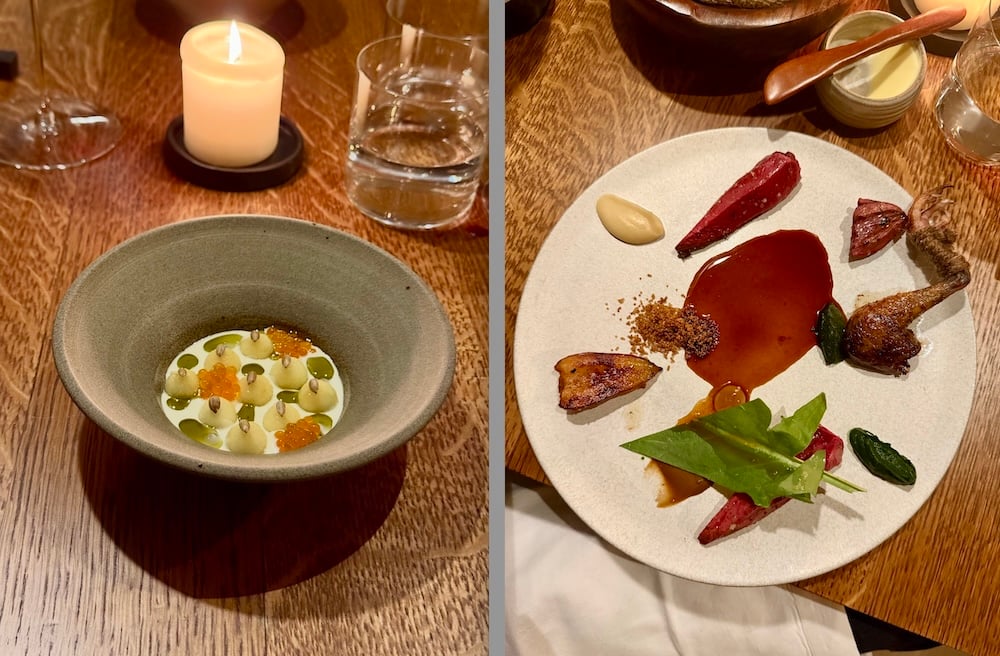 Pain traditionnel cuit au BBQ à la graisse de canard, huître associée au poireau et au petit lait, granité de betterave en guise de pré-dessert, tartelette friable au bleu d’Auvergne pour faire passer le fromage, immaculé dessert autour de l’épeautre. En plat phare, le pigeon, servi en tableau, avec son cœur, sa cuisse, son oseille, et son persil brûlé, manie à merveille l’art de la déconstruction.