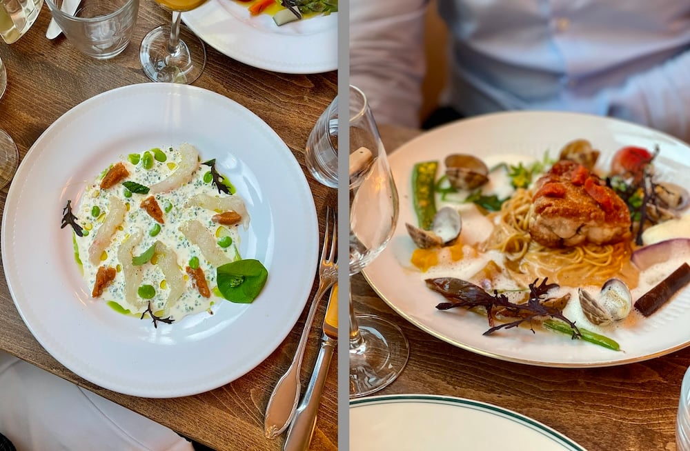 C’est toujours aussi délicieux, avec de nouvelles entrées de saison et de compétition : asperges blanches meunières, araignée de mer adoucie au miel, fraises et petits pois, et des langoustines crues du Guilvinec, associées au corail d’oursin petit violet, crème crue, jeune ciboulette, merveille absolue.